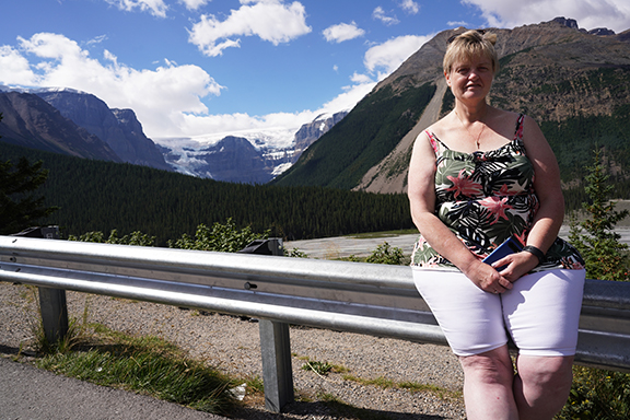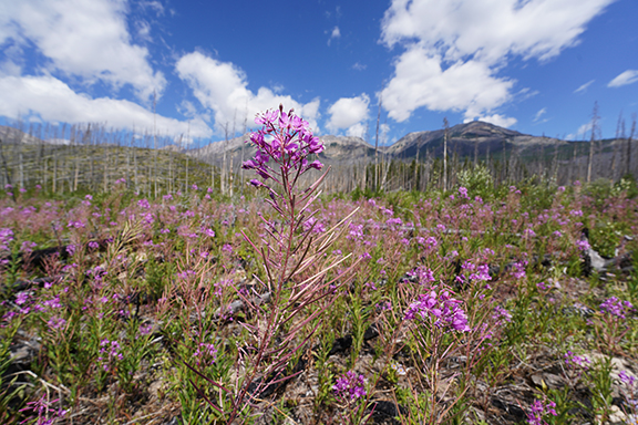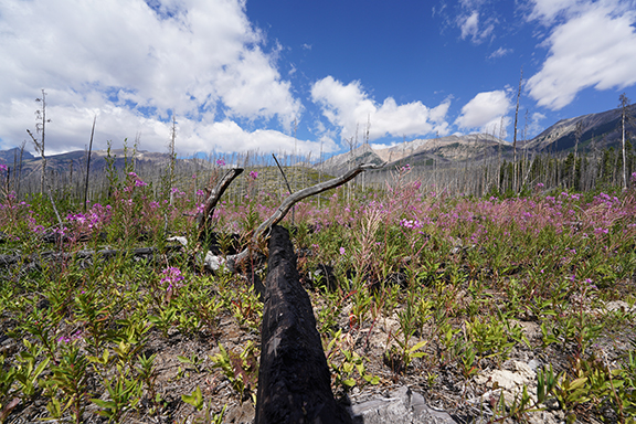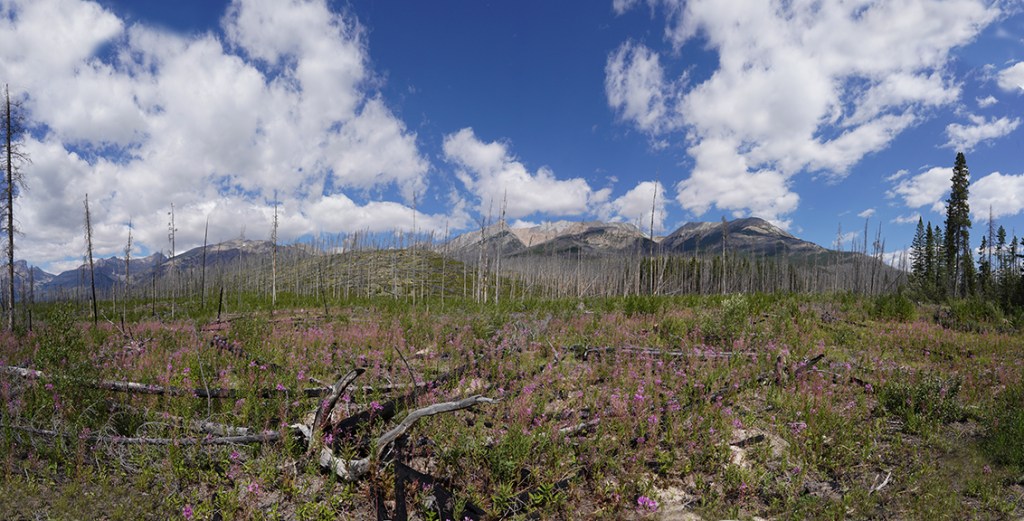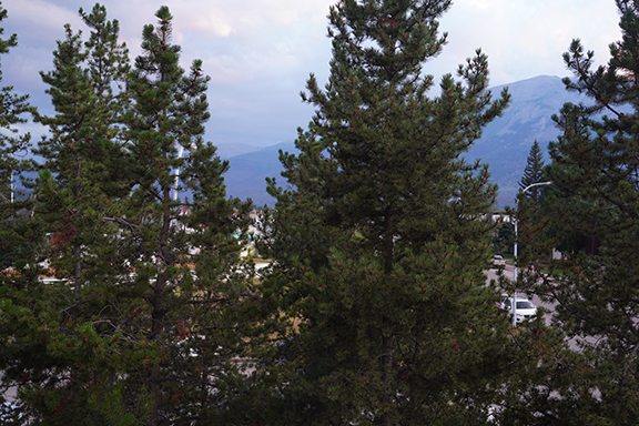 With all the forest fires in British Columbia this summer, we’ve had a lot of smoke in the air and when we left on August 6th it was no exception. Everything off in the distance had a slightly hazy look to it as we drove west but about 1/2 way between the Siffleur Falls parking lot and the Banff National Park East Gate we approached a thick wall of smoke that was like a curtain across the road. Soon you could taste the smoke in the car. Not nearly as much as you could when we stopped for lunch at The Crossing Resort at Saskatchewan River Crossing though. Mountain air wasn’t what I remembered it being. Lunch was pretty good and a lot less money than I had envisioned when we stopped.