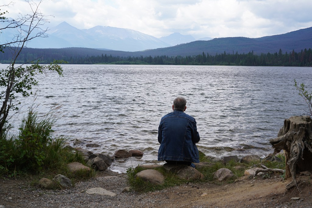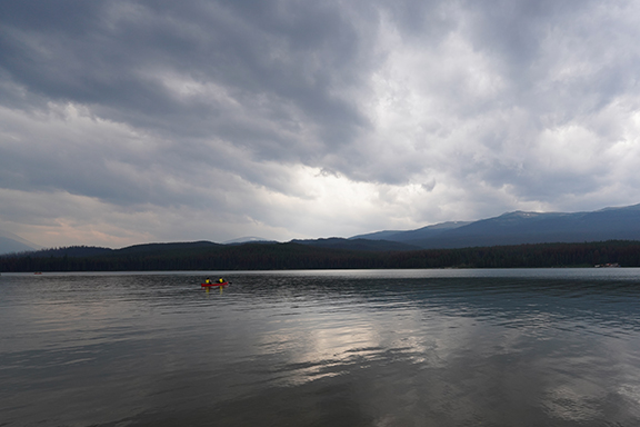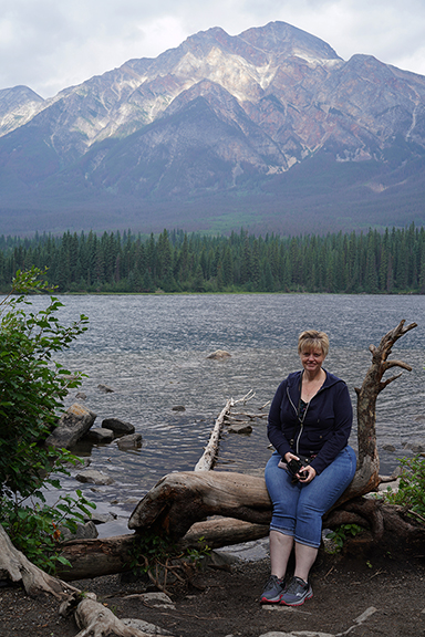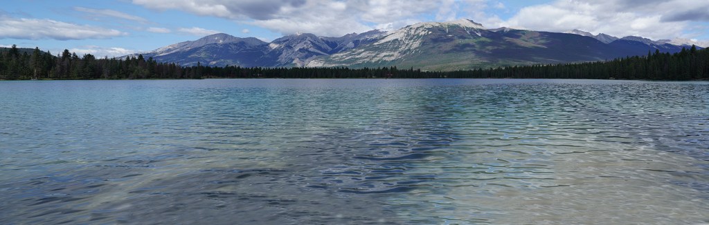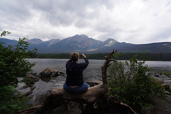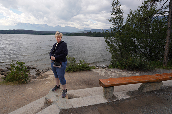 We went back towards the Jasper Park Lodge and decided that Edith Lake looked good so we found a picnic table there and had our left over pizza and the Greek salad Lynda had made. After our late lunch we walked down to the shore of Edith Lake and watched the world not go by.