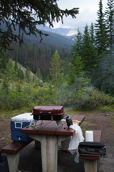 We decided we would head up towards Maligne Lake in search of a picnic lunch spot. It rained on and off on our way and we saw a spot not long after we cleared on of the rain showers so we pulled over to barbecue our burgers. There was only 1 other car there when we arrived but soon the small parking area was full and the other picnic tables were in use. We either beat the rush or caused a rush.